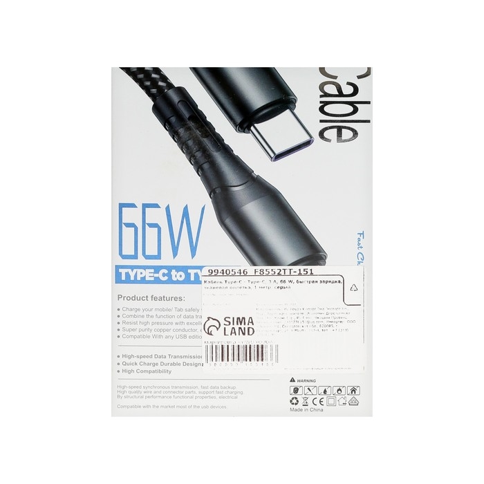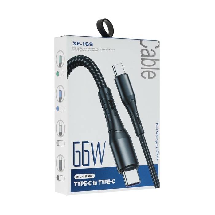 Кабель Type-C - Type-C, 3 А, 66 W, быстрая зарядка, тканевая оплётка, 1 метр, серый
