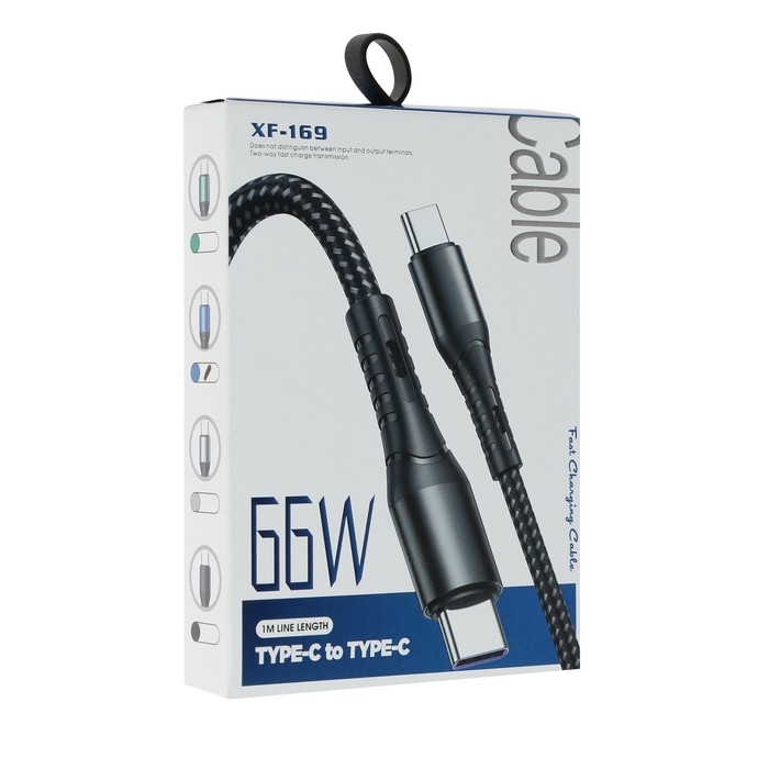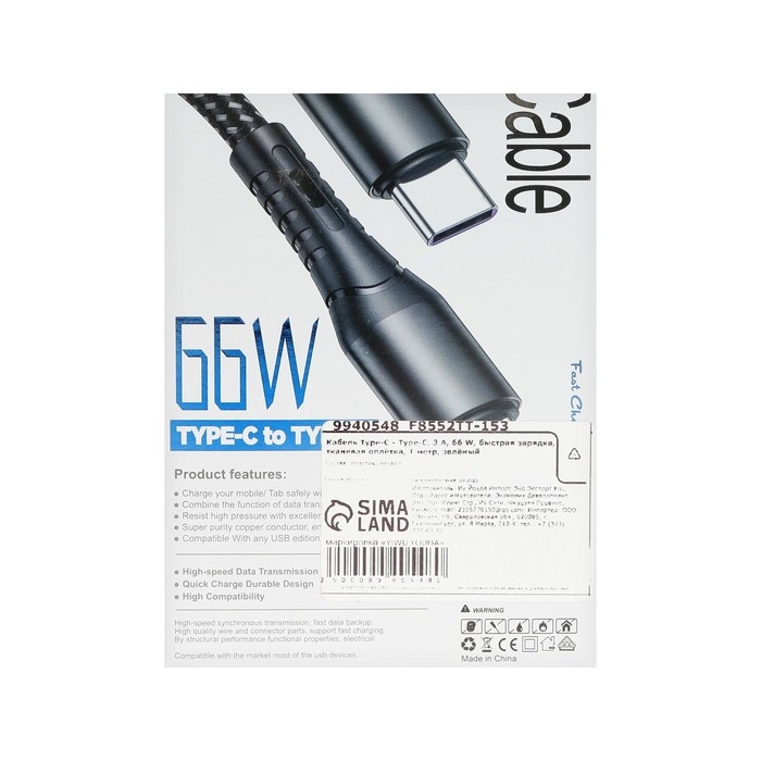 Кабель Type-C - Type-C, 3 А, 66 W, быстрая зарядка, тканевая оплётка, 1 метр, зелёный
