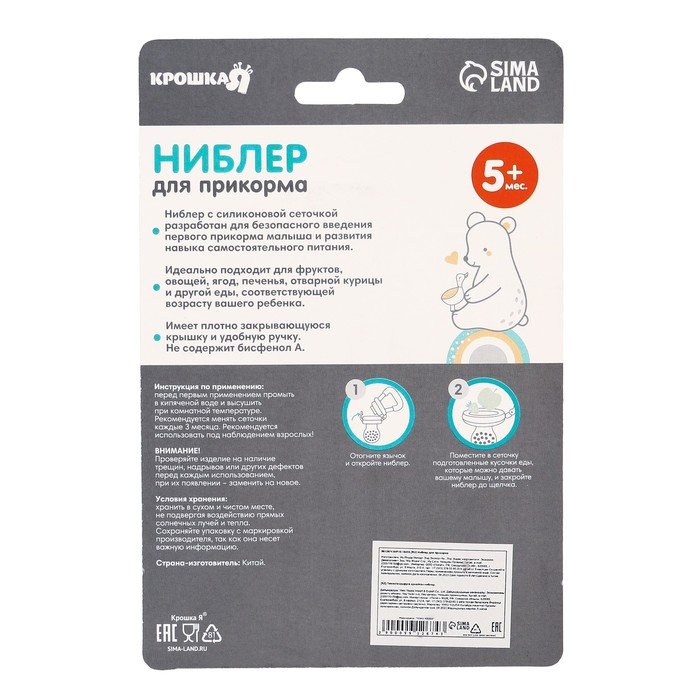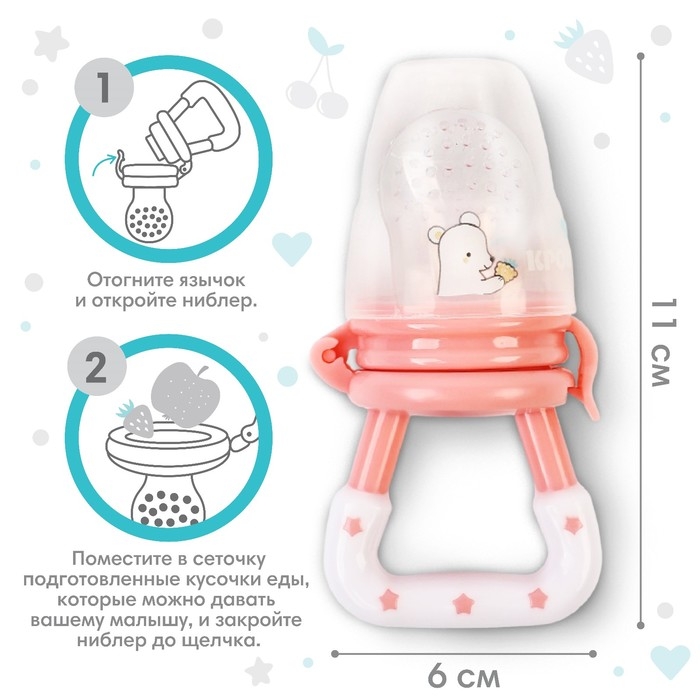 Изделие для прикорма (ниблер) пригодится в период, когда ребёнок переходит с кашки и молока на твёрдую пищу. Приспособление разовьёт у крохи жевательные навыки. Также предмет будет безопасно массировать дёсны во время прорезывания зубов.