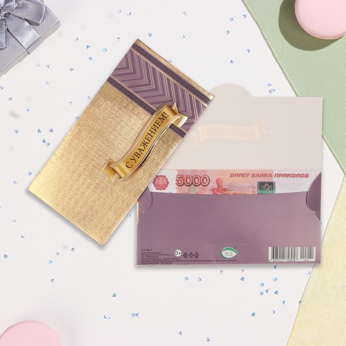 Конверт для денег "С уважением!" тиснение, золотистый фон, 16,5х8,5 см