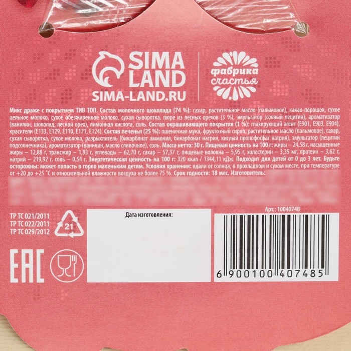 Состав молочного шоколада (74 %): сахар, растительное масло (пальмовое), какао-порошок, сухое цельное молоко, сухое обезжиренное молоко, сухая сыворотка, пюре из лесных орехов (3 %), эмульгатор (соевый лецитин), ароматизатор (ванилин, шоколад, лесной орех), лимонная кислота, соль. Состав окрашивающего покрытия (1 %): глазирующий агент (E901, E903, E904), красители (E133, E129, E110, E171, E124). Состав печенья (25 %): пшеничная мука, фруктозный сироп, растительное масло (пальмовое), сахар, сухая сыворотка, сухое молоко, разрыхлитель (бикарбонат аммония, бикарбонат натрия, кислый пропофосфат натрия), эмульгатор (лецитин подсолнечника), ароматизатор (ванилин, масло сливочное), соль.