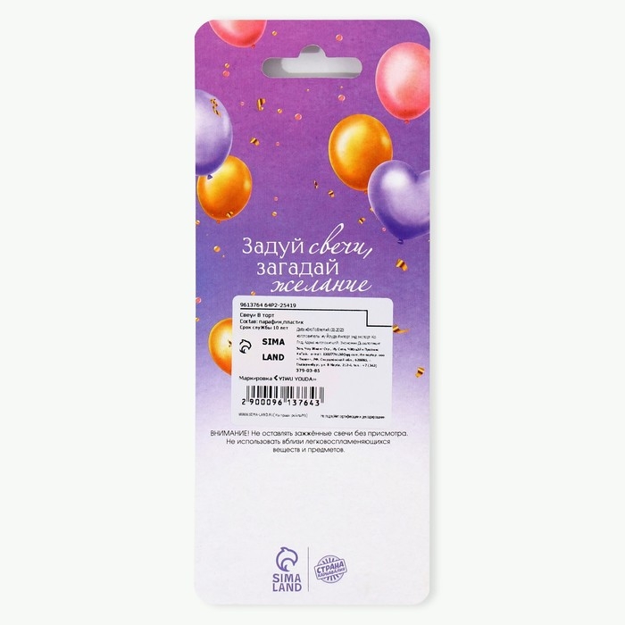 Свечи для торта - это неотъемлемый атрибут праздника. Набор свечей станет прекрасным украшением торта и других кондитерских изделий по случаю дня рождения, юбилея и любого другого торжества. Украсьте угощение стильными свечами, чтобы сделать особенный день ещё более ярким и незабываемым. Для того, чтобы свечи не задувались, им нужно дать 60 секунд разгореться, после чего их можно будет задувать, но уже через несколько секунд, как они погаснут, свечи загорятся снова. Для того,чтобы свечи все-таки потушить, их рекомендуется примочить водой или придавить фитиль свечи. Изготовлены из высокоочищенного пищевого парафина, который не влияет на вкусовые качества блюд, а удобная упаковка помогает сохранять свечи при длительном хранении и транспортировке.
