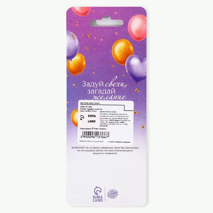 Свечи для торта - это неотъемлемый атрибут праздника. Набор свечей станет прекрасным украшением торта и других кондитерских изделий по случаю дня рождения, юбилея и любого другого торжества. Украсьте угощение стильными свечами, чтобы сделать особенный день ещё более ярким и незабываемым. Для того, чтобы свечи не задувались, им нужно дать 60 секунд разгореться, после чего их можно будет задувать, но уже через несколько секунд, как они погаснут, свечи загорятся снова. Для того,чтобы свечи все-таки потушить, их рекомендуется примочить водой или придавить фитиль свечи. Изготовлены из высокоочищенного пищевого парафина, который не влияет на вкусовые качества блюд, а удобная упаковка помогает сохранять свечи при длительном хранении и транспортировке.