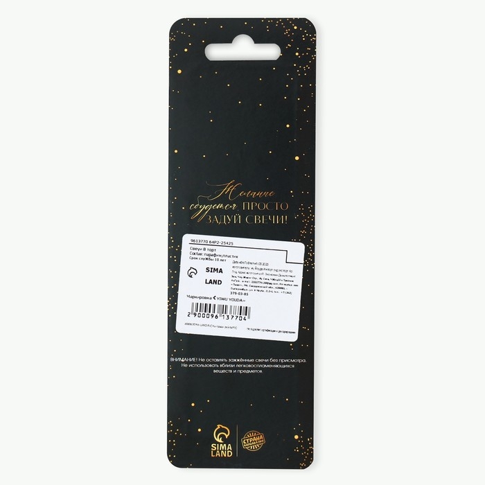 Свечи для торта - это неотъемлемый атрибут праздника. Набор свечей станет прекрасным украшением торта и других кондитерских изделий по случаю дня рождения, юбилея и любого другого торжества. Украсьте угощение стильными свечами, чтобы сделать особенный день ещё более ярким и незабываемым. Для того, чтобы свечи не задувались, им нужно дать 60 секунд разгореться, после чего их можно будет задувать, но уже через несколько секунд, как они погаснут, свечи загорятся снова. Для того,чтобы свечи все-таки потушить, их рекомендуется примочить водой или придавить фитиль свечи. Изготовлены из высокоочищенного пищевого парафина, который не влияет на вкусовые качества блюд, а удобная упаковка помогает сохранять свечи при длительном хранении и транспортировке.