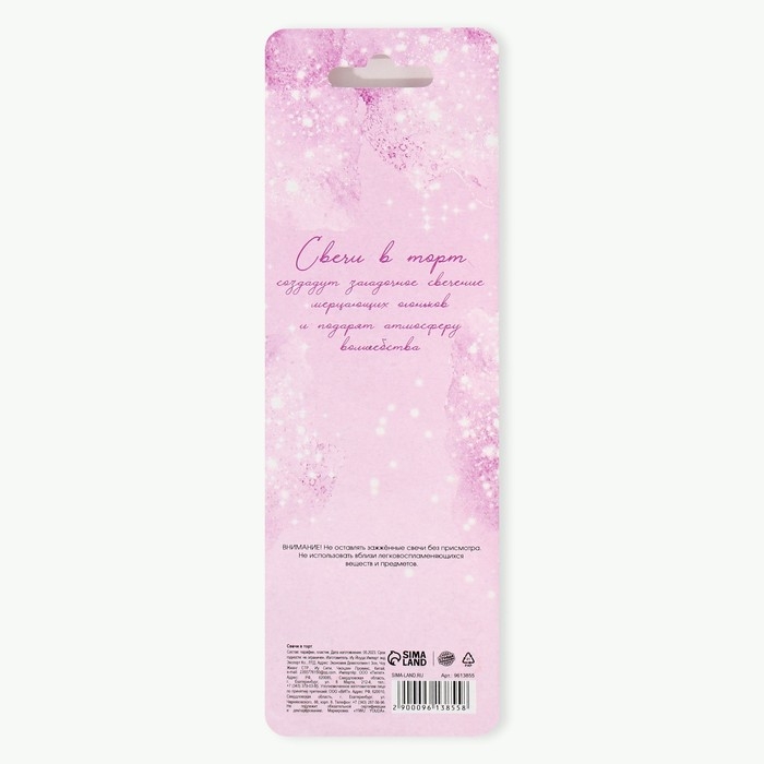 Свечи для торта - это неотъемлемый атрибут праздника. Набор свечей станет прекрасным украшением торта и других кондитерских изделий по случаю дня рождения, юбилея и любого другого торжества. Украсьте угощение стильными свечами, чтобы сделать особенный день ещё более ярким и незабываемым. Для того, чтобы свечи не задувались, им нужно дать 60 секунд разгореться, после чего их можно будет задувать, но уже через несколько секунд, как они погаснут, свечи загорятся снова. Для того,чтобы свечи все-таки потушить, их рекомендуется примочить водой или придавить фитиль свечи. Изготовлены из высокоочищенного пищевого парафина, который не влияет на вкусовые качества блюд, а удобная упаковка помогает сохранять свечи при длительном хранении и транспортировке.