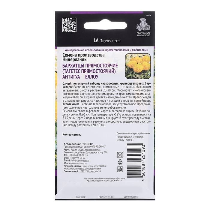 Самый популярный гибрид низкорослых крупноцветковых бархатцев! Растения генетически компактные с отличным базальным ветвлением. Высота растения – 20-30 см. Формирует многочисленные прочные цветоносы с густомахровыми крупными цветками диаметром 8-10 см. Окраска цветка – насыщенно-желтая. Превосходен в озеленении широких массивов и посадки в горшки, контейнеры.Агротехника. Растение теплолюбивое, засухоустойчивое. Предпочитает солнечное место, к почвам не требовательно. Семена высевают в феврале-марте в рассадные ящики. Глубина заделки семян 0,5-1 см. При температуре +18°C всходы появляются на 7-15 день. Через 2 недели сеянцы пикируют. В грунт рассаду высаживают после окончания весенних заморозков, выдерживая расстояние между растениями 30-40 см. Семена соответствуют требованиям международных стандартов и ГОСТу РФ 12260-81