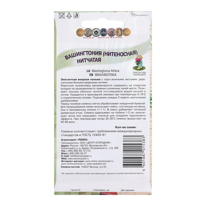Элегантная веерная пальма с серо-зелеными листьями, украшенными белыми ажурными нитями. Взрослые экземпляры рекомендуется содержать на открытом воздухе на защищенном от прямых солнечных лучей месте.Агротехника. Поливают пальмы обильно теплой отстоявшейся водой весной и летом. Нуждается в прохладной зимовке при температуре 5-10°С и ограниченном поливе. Подкормка каждые 2 недели цветочными удобрениями. Перед посевом семена слегка обрабатывают наждачной бумагой. Для проращивания семян используют смесь, состоящую из песка, мха и пропаренных опилок (1:1:1). В смесь добавляют толченый древесный уголь. Семена заделывают на глубину 1-2 см, мульчируют мхом или накрывают пленкой для создания парникового эффекта. При температуре почвы 25-30°С семена прорастают на 45-60 день.Семена соответствуют требованиям международных стандартов и ГОСТу РФ 12420-81