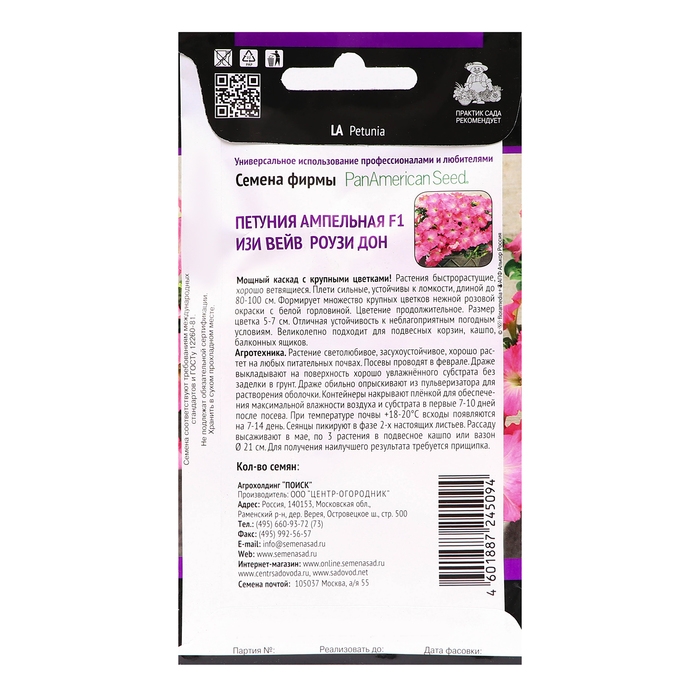 Мощный каскад с крупными цветками! Растения быстрорастущие, хорошо ветвящиеся. Плети сильные, устойчивы к ломкости, длиной до 80-100 см. Формирует множество крупных цветков нежной розовой окраски с белой горловиной. Цветение продолжительное. Размер цветка 5-7 см. Отличная устойчивость к неблагоприятным погодным условиям. Великолепно подходит для подвесных корзин, кашпо, балконных ящиков.Агротехника. Растение светолюбивое, засухоустойчивое, хорошо растет на любых питательных почвогрунтах. При выращивании рассады посевы проводят в феврале-марте. Семена слегка вдавливают в почву. Посадочную емкость накрывают стеклом и ставят в освещенное место. При температуре почвы +18°C всходы появляются на 14-20 день. Сеянцы пикируют в фазе 2-х настоящих листьев. Рассаду высаживают после окончания весенних заморозков. Чтобы получить идеальное растение в корзине, куст петунии надо формировать, прищипывая побеги.Семена соответствуют требованиям международных стандартов и ГОСТу РФ 12260-81