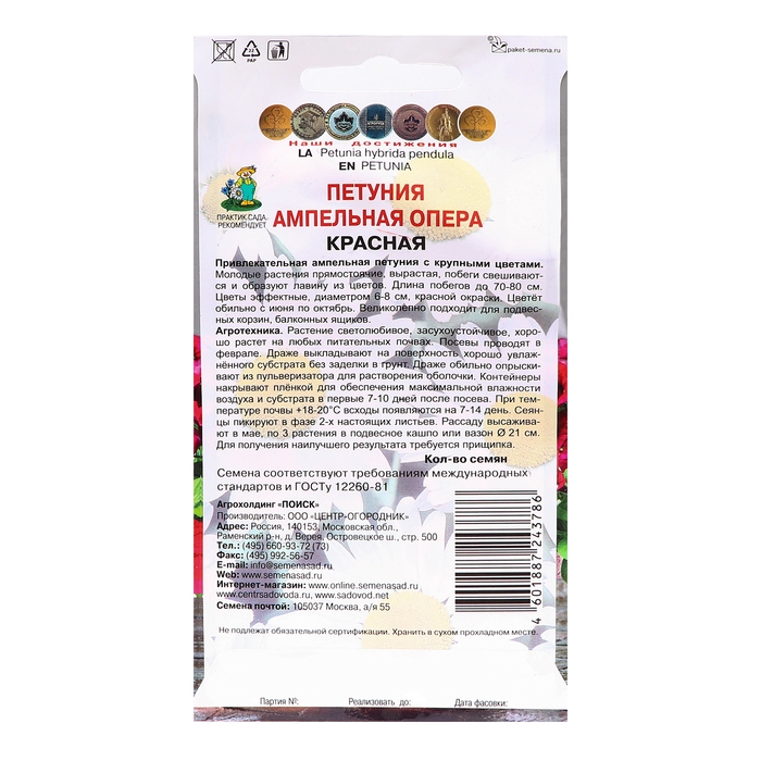 Привлекательная ампельная петуния с крупными цветами. Молодые растения прямостоячие, вырастая, свешиваются и образуют лавину из цветов (побеги достигают длины 70-80 см). Цветы эффектные, диаметром 8 см, красной окраски. Цветёт обильно с июня по октябрь. Великолепно подходит для подвесных корзин, балконных ящиков.Агротехника. Растение светолюбивое, засухоустойчивое, хорошо растет на любых питательных почвах.При выращивании рассады посевы проводят в феврале-марте. Драже слегка вдавливают в почву. Посадочную емкость накрывают стеклом и ставят в освещенное место. При температуре +18°C всходы появляются на 14-20 день. Сеянцы пикируют в фазе 2-х настоящих листьев. Рассаду высаживают после окончания весенних заморозков.Семена соответствуют требованиям международных стандартов и ГОСТу РФ 12260-81
