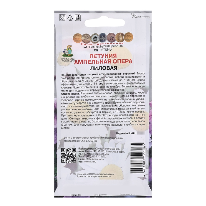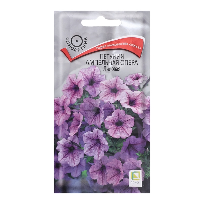 Привлекательная петуния с "жилкованной" окраской. Молодые растения прямостоячие, вырастая, побеги свешиваются и образуют лавину из цветов. Длина побегов до 70-80 см. Цветы эффектные диаметром 5-6 см, нежно-розовые с фиолетовыми жилками. Цветет обильно с июня по октябрь. Великолепно подходит для подвесных корзин, балконных ящиков.Агротехника. Растение светолюбивое, засухоустойчивое, хорошо растет на любых питательных почвах. При выращивании рассады посевы проводят в феврале-марте. Семена слегка вдавливают в почву. Посадочную емкость накрывают стеклом и ставят в освещенное место. При температуре +18°C всходы появляются на 14-20 день. Сеянцы пикируют в фазе 2-х настоящих листьев. Рассаду высаживают после окончания весенних заморозков. Семена соответствуют требованиям международных стандартов и ГОСТу РФ 12260-81