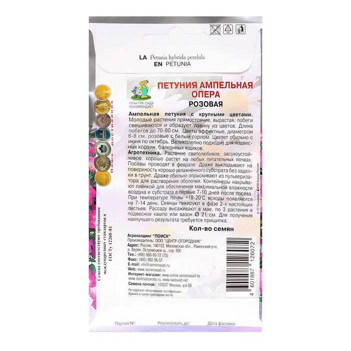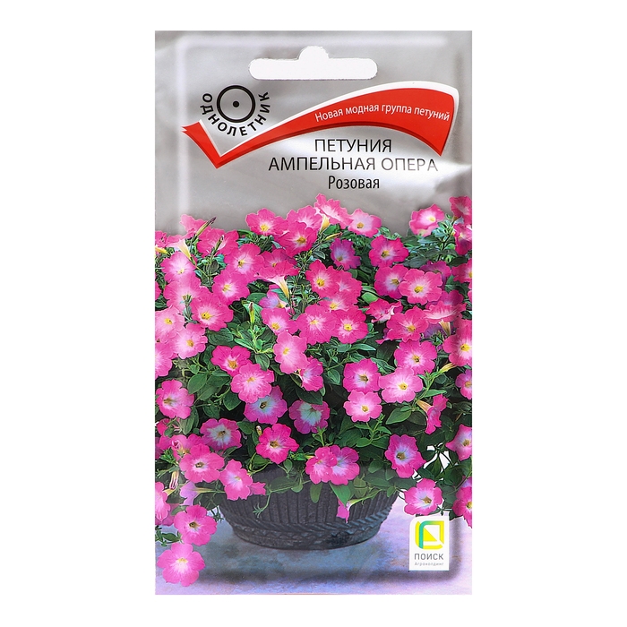 Ампельная петуния с крупными цветами. Растение формирует побеги, достигающие в длину 70-80 см, со множеством крупных цветов. Цветы эффектные, диаметром 6-8 см, розовые с белым горлом. Цветет обильно с июня по октябрь. Великолепно подходит для подвесных корзин, балконных ящиков.Агротехника. Растение светолюбивое, засухоустойчивое, хорошо растет на любых питательных почвогрунтах. При выращивании рассады посевы проводят в феврале-марте. Семена слегка вдавливают в почву. Посадочную емкость накрывают стеклом и ставят в освещенное место. При температуре +18°C всходы появляются на 14-20 день. Сеянцы пикируют в фазе 2-х настоящих листьев. Рассаду высаживают после окончания весенних заморозков. Семена соответствуют требованиям международных стандартов и ГОСТу РФ 12260-81