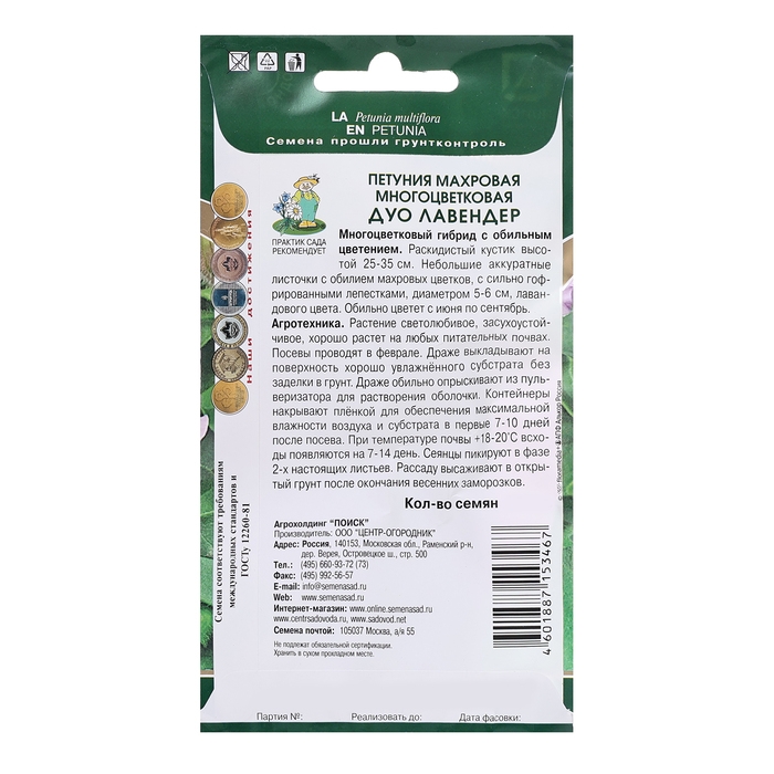Многоцветковый гибрид с обильным цветением. Раскидистый кустик высотой 25-35 см. Небольшие аккуратные листочки с обилием махровых цветков, с сильно гофрированными лепестками, диаметром 5-6 см, лавандового цвета. Обильно цветет с июня по сентябрь.Агротехника. Растение светолюбивое, засухоустойчивое, хорошо растет на любых питательных почвах. Посев семян на рассаду проводят в феврале-марте. Семена слегка вдавливают в почву, землей не присыпают. Посадочную емкость накрывают стеклом и ставят в освещенное место. При температуре почвы +18-20°C всходы появляются на 14-20 день. Сеянцы пикируют в фазе 2-х настоящих листьев. Рассаду высаживают в открытый грунт после окончания весенних заморозков.Семена соответствуют требованиям международных стандартов и ГОСТу РФ 12260-81