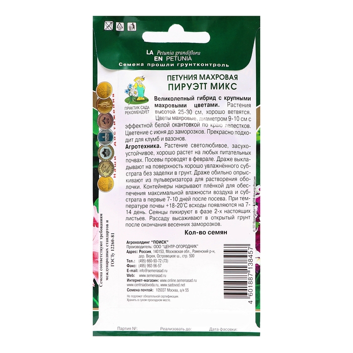 Великолепный гибрид с крупными махровыми цветами. Раскидистый кустик высотой 25-35 см и диаметром около 30 см. Цветы крупные, красивые, диаметром 9-10 см, разнообразной окраски. Обильно цветет с июня по сентябрь.Агротехника. Растение светолюбивое, засухоустойчивое, хорошо растет на любых питательных почвогрунтах. Посев семян на рассаду проводят в феврале-марте. Семена слегка вдавливают в почву, землей не присыпают. Посадочную емкость накрывают стеклом и ставят в освещенное место. При температуре почвы +18-20°С всходы появляются на 14-20 день. Сеянцы пикируют в фазе 2-х настоящих листьев. Рассаду высаживают в открытый грунт после окончания весенних заморозков.Семена соответствуют требованиям международных стандартов и ГОСТу РФ 12260-81