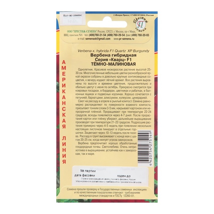 Семена цветов Вербена "Кварц", Тёмно-малиновая, F1, 5 шт