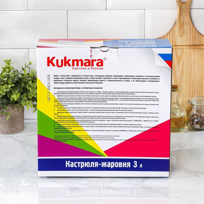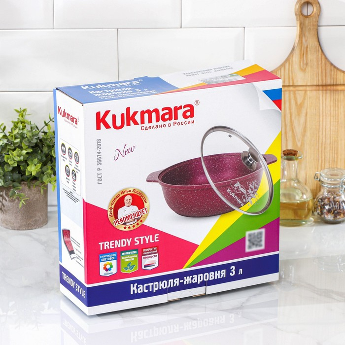 Посуда линии Trendy style разработана в соответствии с последними модными тенденциям. Кастрюля-жаровня Kukmara сделана из литого алюминия. С внутренней и внешней стороны имеет антипригарное покрытие повышенной прочности на водной основе, которое изготовлено по немецким технологиям (Weilburger Coatings GmbH).