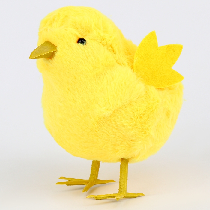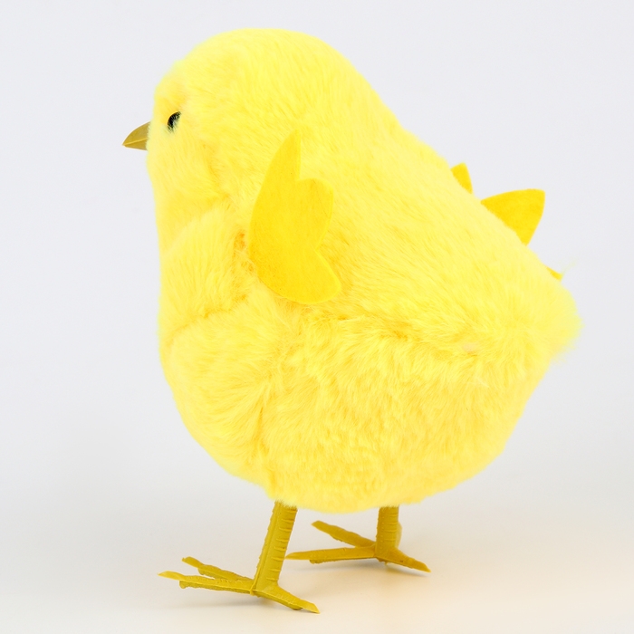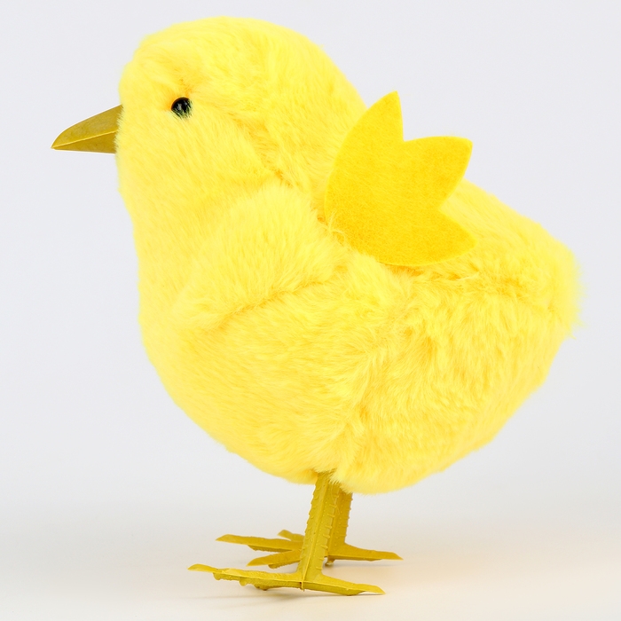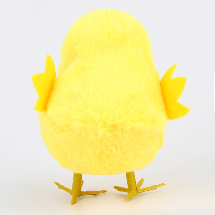 - Тело цыплёнка изготовлено из мягкого на ощупь искусственного меха, а клюв и лапки — из пластика.