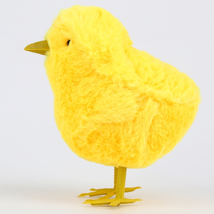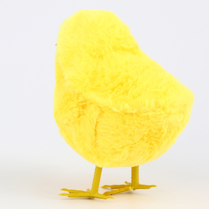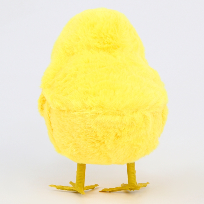 - Тело цыплёнка изготовлено из мягкого на ощупь искусственного меха, а клюв и лапки — из пластика.
