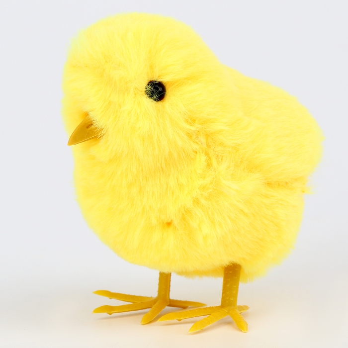 - Тело цыплёнка изготовлено из мягкого на ощупь искусственного меха, а клюв и лапки — из пластика.