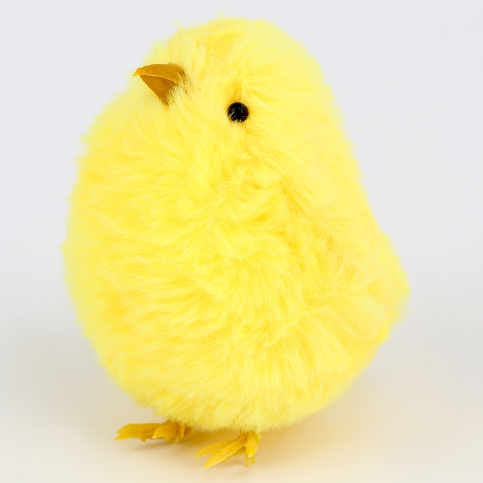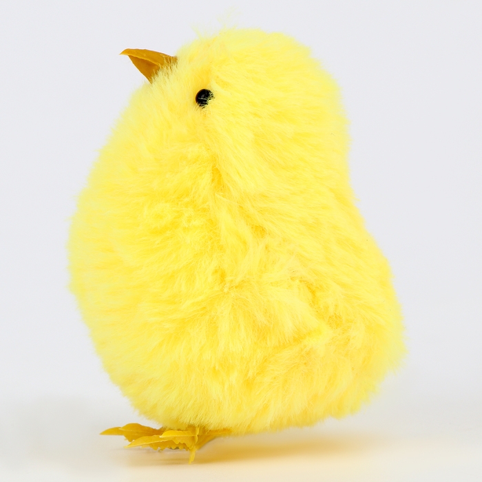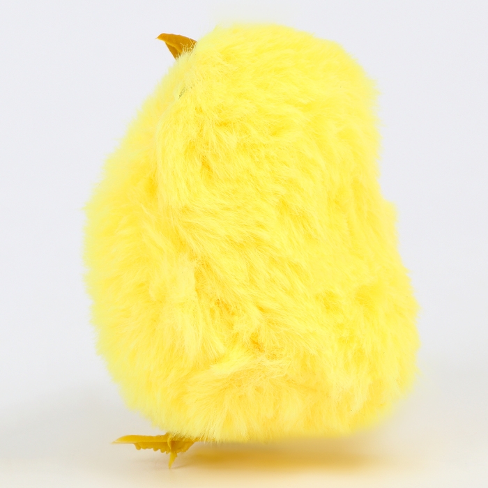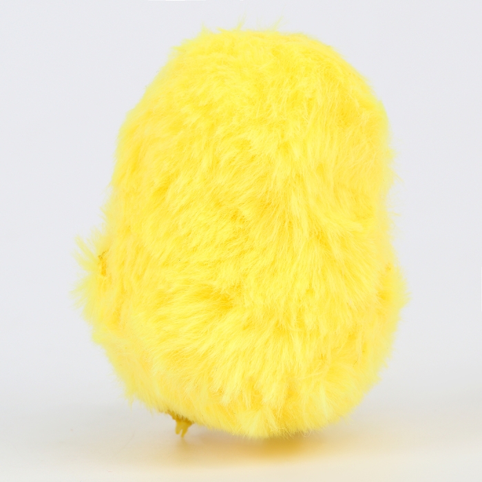 - Тело цыплёнка изготовлено из мягкого на ощупь искусственного меха, а клюв и лапки — из пластика.