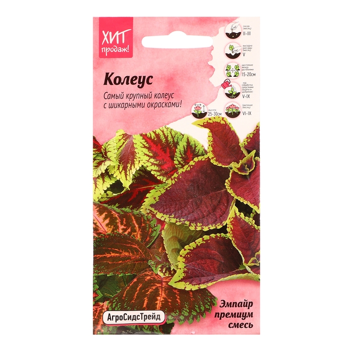 Экзотическое растение с декоративной листвой! Исключительно легкое в уходе, но при этом очень красивое растение с яркими листьями и сочными стеблями для дома и сада. В грунте не зимует, поэтому осенью необходимо пересадить в горшок и убрать в помещение. Формирует кустик высотой 45-50 см и шириной 38-45см с хорошо разветвленными и густооблиственными побегами. Данная смесь колеусов отличается очень крупными листьями с необычными узорами. Растения с отличным ветвлением. Наилучший вид достигается на тенистых участках. Цветки мелкие, невзрачные, собраны в колосовидное соцветие. Колеус – незаменимая культура для создания бордюров, рабаток, вазонов и кашпо. Великолепная тенелюбивая альтернатива для больших контейнеров, комбинаций растений и открытого грунта. Можно выращивать как комнатное растение. Агротехника: Колеус (крапивка) – тепло-, свето- и влаголюбивая культура, предпочитает плодородные хорошо окультуренные почвы. На рассаду семена высевают в феврале-марте. Для прорастания семян необходимо достаточное освещение и температура 21-25˚С. Всходы появляются через 10-14 дней. В фазе 2-го настоящего листа сеянцы пикируют. Для формирования невысокого пышного кустика необходимо проводить прищипывание. Дополнительное освещение обеспечит более насыщенную окраску листьев. На постоянное место рассаду высаживают в мае, когда минует угроза заморозков, по схеме 15х20 см или в отдельные горшки. Уход заключается в регулярных обильных поливах и опрыскиваниях, подкормках каждые 10-14 дней и формирующих обрезках. Штрих-код -