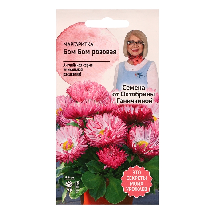 Новинка 2019 года! Многолетнее рано и обильно цветущее весеннее растение, выращиваемое в двулетней культуре. Растение компактное, низкорослое, высотой 13-15 см, с многочисленными прочными цветоносами, увенчанными крупными махровыми соцветиями розового цвета. В период цветения кустик полностью покрыт игольчатыми соцветиями, достигающими в диаметре 5-6 см. Растение выносливое, морозоустойчивое, не нуждается в яровизации, поэтому может продаваться как осенью, так и весной. Маргаритка прекрасно смотрится в бордюрах и низких цветниках, каменистых горках, на переднем плане цветников и миксбордеров. цветниках, каменистых горках, на переднем плане цветников и миксбордеров. Агротехника: Маргаритка предпочитает солнечные места с легкой плодородной почвой. Для получения цветущих растений в первый год семена на рассаду высевают в начале марта. При выращивании в двулетней культуре посев проводят в июле-августе. Семена распределяют по поверхности почвы, не заглубляя, всходы появляются через 6-12 дней. Через 14-20 дней сеянцы пикируют в рассадные грядки по схеме 10×10 см. В начале августа растения высаживают на постоянное место на расстоянии 20 см друг от друга. Цветение начинается на следующий год рано весной и продолжается до наступления жаркой погоды. Хорошо размножается делением куста. Штрих-код - 4650091483600