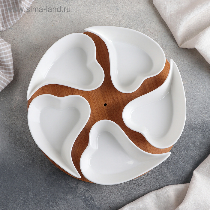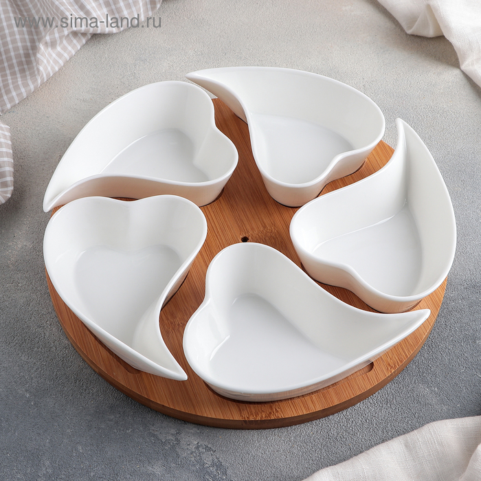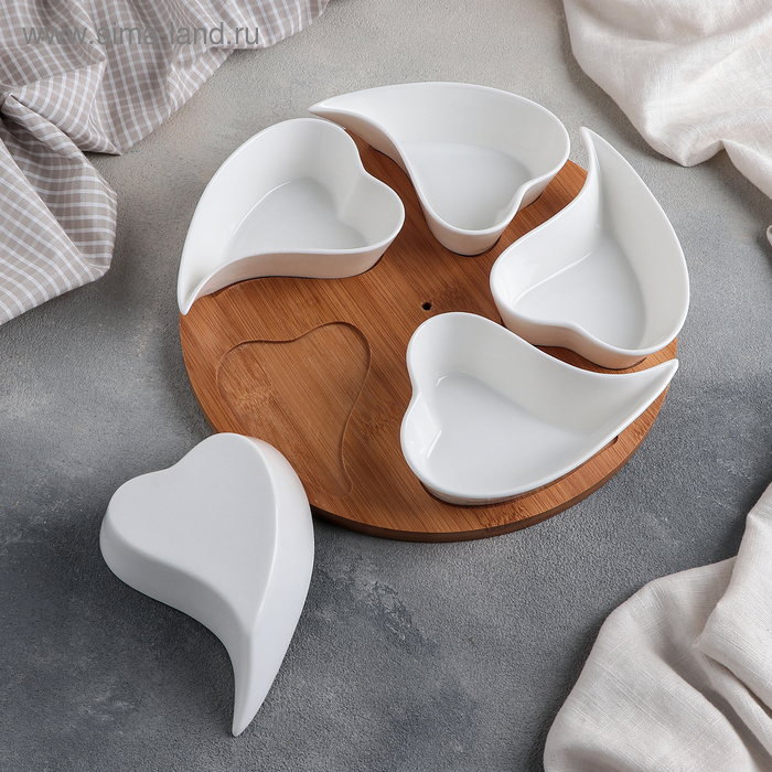 Набор соусников керамических на деревянной подставке «Эстет. Сердца», 5 предметов: 200 мл, цвет белый