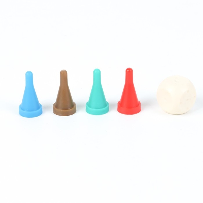 4 фишки (высота фишки 2.3 см, диаметр 1.2 см) и кубик 1.6 х 1.6 х 1.6 см