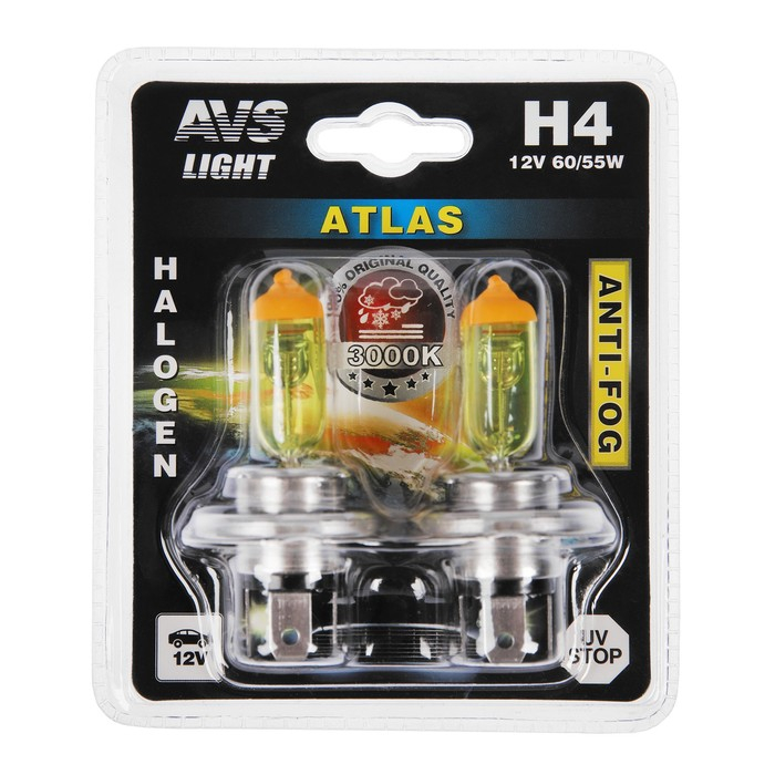 Галогенная лампа AVS ATLAS ANTI-FOG, желтый, H4, 12 В, 60/55 Вт, набор 2 шт