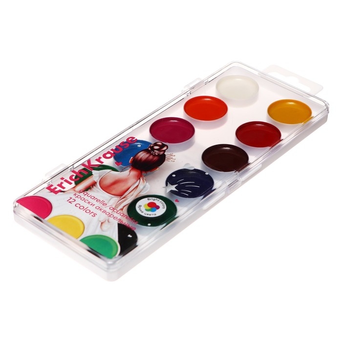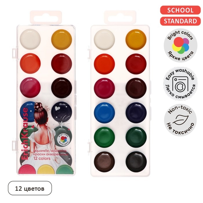 Акварель 12 цветов, ErichKrause, без кисти, мягкий пластик, картонная коробка, европодвес (эконом упаковка)