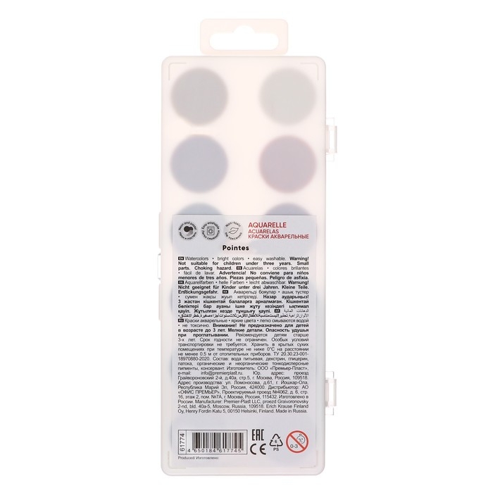 Акварель 12 цветов, ErichKrause Pointes, без кисти, пластиковая коробка, европодвес