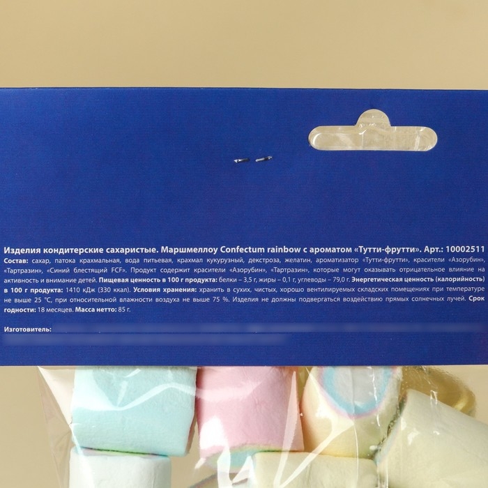 Состав: сахар, патока крахмальная, вода питьевая, крахмал кукурузный, декстроза, желатин, ароматизатор "Тутти-фрутти", красители "Азорубин", "Тартразин", "Синий блестящий FCF".