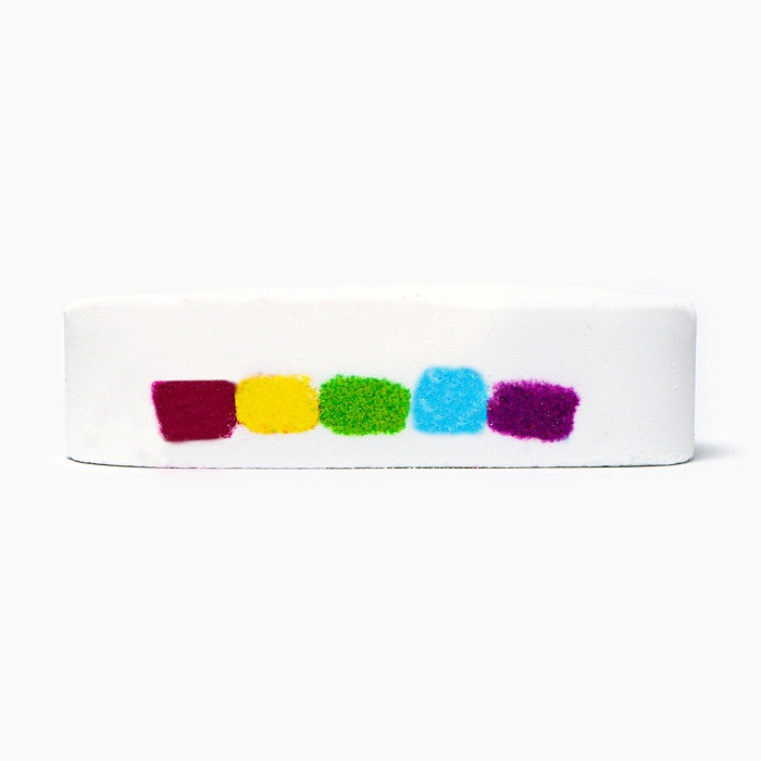При контакте с водой она начинает шоу своего уникального растворения, создавая облако пены и оставляя за собой восхитительный радужный след на поверхности ванны.