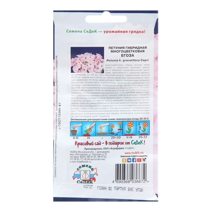 Крупноцветковый гибрид петунии серии Капри с невероятно крупными цветками и обильным продолжительным цветением, адаптируется к широкому диапазону температур, от -5°C до +40°C. Растение мощное, прямостоячее, высотой 20-25 см, ширина куста 40-50 см. Цветки одиночные, воронковидные, крупные, диаметром 12-14 см, нежно-розового цвета с контрастными прожилками в центре. Петуния свето- и теплолюбива, предпочитает суглинистые и супесчаные, водопроницаемые, плодородные почвы. Не выносит сырых и кислых почв. При выращивании в контейнерах их объём должен быть достаточно большим, не менее 14-20 см. Необходим регулярный полив и регулярные подкормки полным минеральным удобрением, чтобы растение цвело в течение всего теплого периода и могло показать себя во всей красе. Посев семян на рассаду проводят в конце Февраля-Марте. Семена слегка вдавливают в почву, не присыпая землей, хорошо увлажняют из распылителя. При попадании влаги на гранулу оболочка должна раствориться. Посевы накрывают стеклом или целлофаном для сохранения постоянной влажности и до полных всходов, ставят в освещенное место. Рассаду высаживают в открытый грунт через 7-9 недель или после окончания весенних заморозков. Идеально подходит для всех типов использования: для горшков, контейнеров, подвесных корзин, для озеленения клумб, бордюров.Оптимальная для прорастания семян температура почвы 20-25º С
