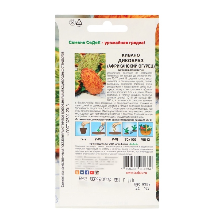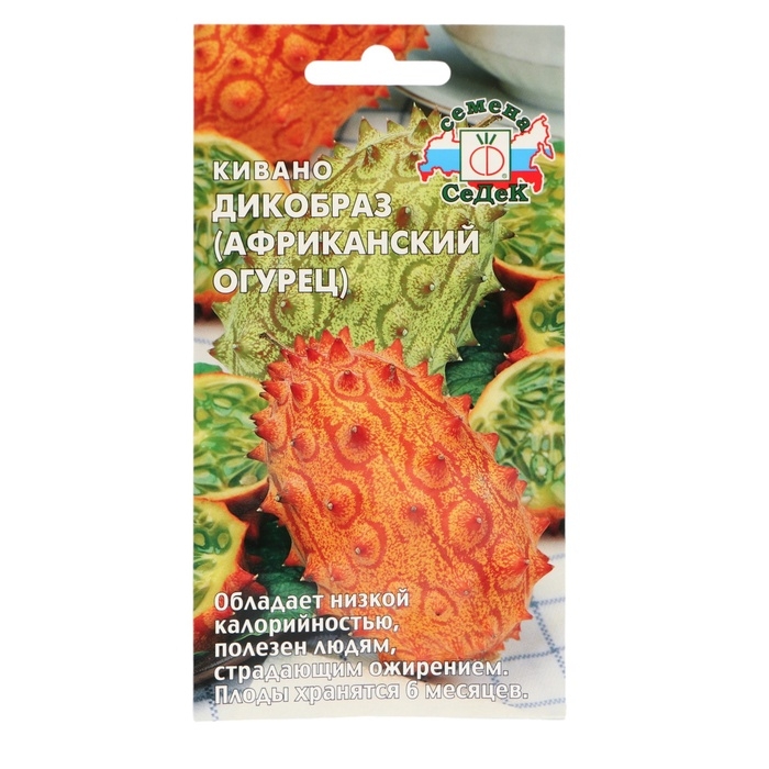 Однолетнее растение из семейства Тыквенных. От всходов до спелости плодов 75-77 дней. В средней полосе выращивается в защищенном грунте, только рассадным способом. Растение очень декоративно и представляет собой вьющуюся лиану с несколькими стеблями, которая достигает 3-5 м в длину. Плоды овальные, с толстой кожурой, покрытые шипами, длиной 10-15 см, массой 150-200 г, в технической спелости зеленые, в биологической ярко-оранжевые, с зеленовато-желтой, похожей на желе сочной и освежающей мякотью и бледно-зелёными семенами. Урожайность плодов до 4,0 кг/м². Плоды хранятся около 6 месяцев, при этом остаются свежими. Мякоть употребляется в пищу вместе с семенами, подходит для приготовления салатов и десертов. Учитывая низкую калорийность, кивано полезен людям, страдающим ожирением.