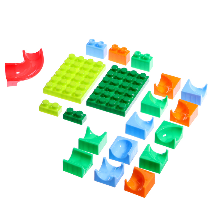 Набор состоит блочных элементов, разноцветных мостиков и извилистых дорожек. Малыш без труда соорудит трассу любой длины и сложности и будет следить за перемещениями шариков.