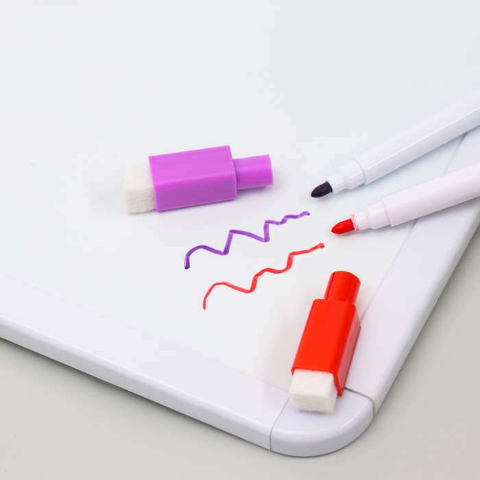 - На колпачке маркера есть войлочная губка и магнит. С помощью губки можно стирать надписи на доске, а с помощью магнита маркер можно хранить, прикрепив его к магнитной доске.