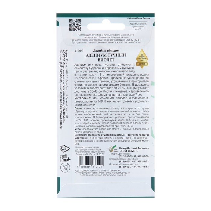 Семена цветов Адениум тучный "Виолет", 3 шт
