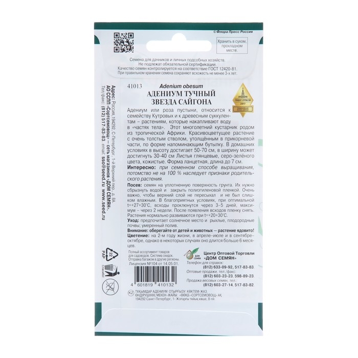Адениум или роза пустыни, относится к семейству Кутровых и к древесным суккулентам – растениям, которые накапливают воду в «частях тела». Этот многолетний кустарник родом из тропической Африки. Красивоцветущее растение с очень толстым стволом, утолщённым в прикорневой части, по форме напоминающим бутылку. В домашних условиях в высоту достигает 50-70 см, в ширину может достигнуть 30-40 см Листья глянцевые, серо-зелёного цвета, кожистые. Форма ланцетная, длина до 7 см. Интересно: при семенном способе выращивания, потомство не на 100 % наследует признаки родительского растения. Посев: семян в плошки на уплотненную поверхность грунта. Их нужно сбрызнуть водой и закрыть полиэтиленовой пленкой. Очень важно, чтобы верхний слой не пересыхал и не был слишком влажным. В благоприятных условиях, при оптимальной t=+27+300С, всходы проклюнутся через 3–5 дней, максимум – через 2 недели. После появления всходов пленку снять. Растения нормально развиваются при t=+20+300С. Уход: предпочитает солнечное место и рыхлые, плодородные почвы; умеренный полив. Внимание: оберегайте от детей и животных — растение ядовито.Цветение: на 2-м году жизни, в апреле–июле и в сентябре–октябре, однако в некоторых случаях оно длится больше 6 месяцев.