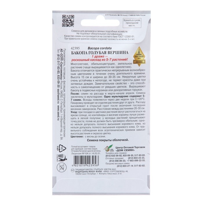 1 драже — роскошный каскад из 5-7 растений.Многолетнее, обильноцветущее, ампельное растение (чаще выращивается как однолетнее). Бакопа отличается практически непрерывным волнообразным цветением в течении очень длительного времени. Высота 15 см и ширина до 30-35 см. Некрупные цветки очень устойчивы к непогоде, не теряют красоты даже при затяжных дождях. Замечательное свойство - это способность к самоочищению от увядших цветков. Выращивают бакопу в подвесных корзинах или декоративных горшках. Посев: семян на рассаду в марте - начале апреля. Семена заключены в мультидраже. Одно мультидраже содержит 5-7 семян. Пикировку проводят в подвесные кашпо, не отделяя растения друг от друга. Всходы появляются через две недели при t=+20ºС. Рассаду высаживают в открытый грунт после окончания последних весенних заморозков. Расстояние между растениями 20-30 см.