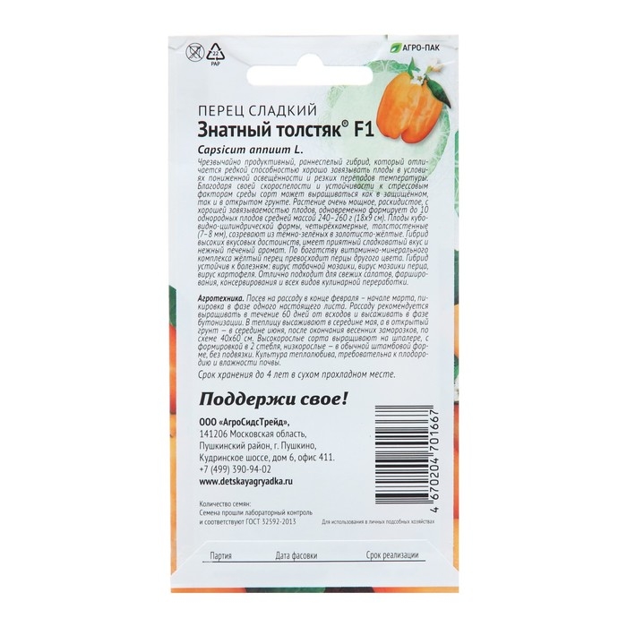 ПЕРЕЦ СЛАДКИЙЗнатный толстяк® F1Capsicum annuum L.Чрезвычайно продуктивный, раннеспелый гибрид, который отли-чается редкой способностью хорошо завязывать плоды в услови-ях пониженной освещённости и резких перепадов температуры.Благодаря своей скороспелости и устойчивости к стрессовымфакторам среды сорт может выращиваться как в защищённом,так и в открытом грунте. Растение очень мощное, раскидистое, схорошей завязываемостью плодов, одновременно формирует до 10однородных плодов средней массой 240–260 г (18x9 см). Плоды кубо-видно-цилиндрической формы, четырёхкамерные, толстостенные(7–8 мм), созревают из тёмно-зелёных в золотисто-жёлтые. Гибридвысоких вкусовых достоинств, имеет приятный сладковатый вкус инежный печеный аромат. По богатству витаминно-минеральногокомплекса жёлтый перец превосходит перцы другого цвета. Гибридустойчив к болезням: вирус табачной мозаики, вирус мозаики перца,вирус картофеля. Отлично подходит для свежих салатов, фарширо-вания, консервирования и всех видов кулинарной переработки.Агротехника. Посев на рассаду в конце февраля – начале марта, пи-кировка в фазе одного настоящего листа. Рассаду рекомендуетсявыращивать в течение 60 дней от всходов и высаживать в фазебутонизации. В теплицу высаживают в середине мая, а в открытыйгрунт — в середине июня, после окончания весенних заморозков, посхеме 40х60 см. Высокорослые сорта выращивают на шпалере, сформировкой в 2 стебля, низкорослые — в обычной штамбовой фор-ме, без подвязки. Культура теплолюбива, требовательна к плодоро-дию и влажности почвы.Срок хранения до 4 лет в сухом прохладном месте.Поддержи свое!