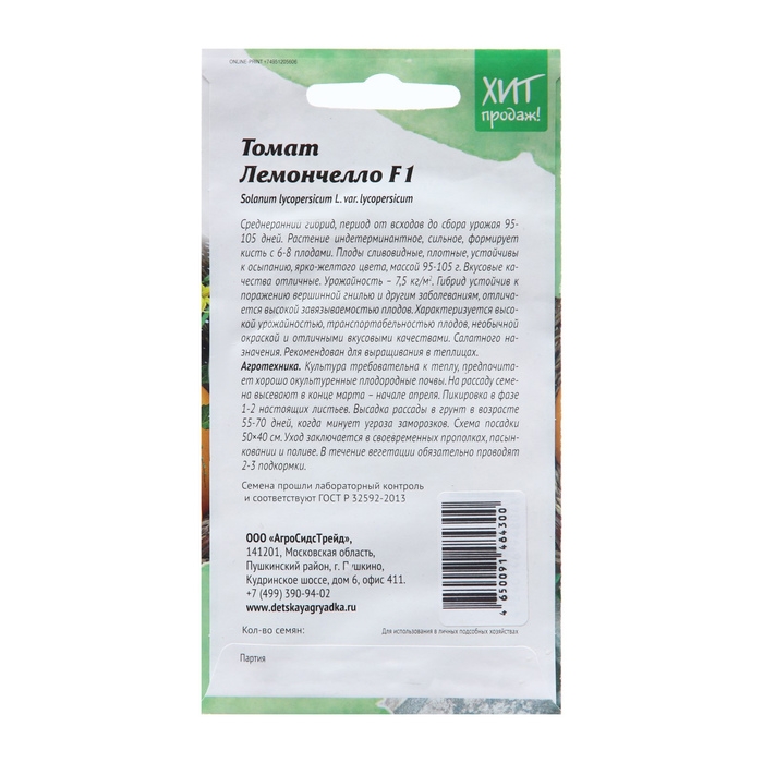 Среднеранний гибрид, период от всходов до сбора урожая 95-105 дней. Растение индетерминантное, сильное, формирует кисть с 6-8-ю плодами. Плоды сливовидные, плотные, устойчивы к осыпанию, ярко-желтого цвета, массой 95-105 г. Вкусовые качества отличные. Урожайность – 7,5 кг/м2. Гибрид устойчив к поражению вершинной гнилью и другим заболеваниям, отличается высокой завязываемостью плодов. Характеризуется высокой урожайностью, транспортабельностью плодов, необычной окраской и отличными вкусовыми качествами. Салатного назначения. Рекомендован для выращивания в теплицах. Агротехника: Культура требовательна к теплу, предпочитает хорошо окультуренные плодородные почвы. На рассаду семена высевают в конце марта – начале апреля. Пикировка в фазе 1-2 настоящих листьев. Высадка рассады в грунт в возрасте 55-70 дней, когда минует угроза заморозков. Схема посадки 50×40 см. Уход заключается в своевременных прополках, пасынковании и поливе. В течение вегетации обязательно проводят 2-3 подкормки. Штрих-код – 4650091484300
