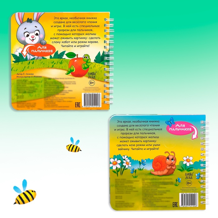 Эти яркие необычные книги созданы для весёлого чтения и игры. В них есть специальные прорези для пальчиков, с помощью которых малыш сможет оживить картинку: сделать хобот слону или рожки корове.