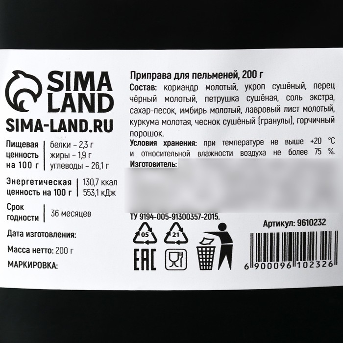 Специи «Для пельменей» для варки: перец черный, кориандр, укроп, 200 г.