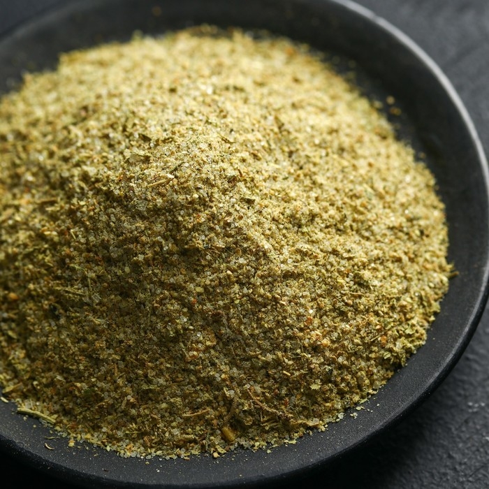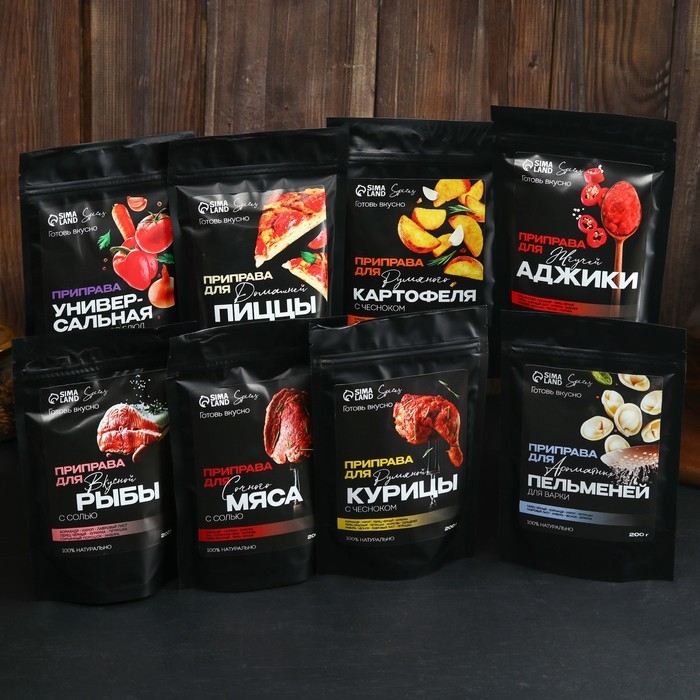 Состав: кориандр молотый, укроп сушёный, перец чёрный молотый, петрушка сушёная, соль экстра, сахар-песок, имбирь молотый, лавровый лист молотый, куркума молотая, чеснок сушёный (гранулы), горчичный порошок.