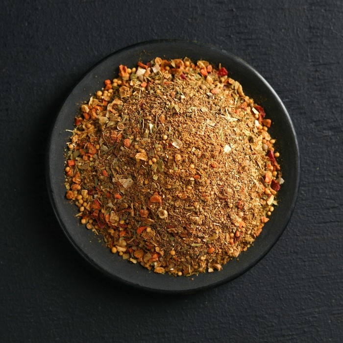 Состав: кориандр, соль экстра, паприка красная сушёная, базилик (зелень сушёная), горчичное семя, лук сушёный, морковь сушёная, горчичный порошок, перец красный молотый, перец чёрный молотый, кориандр сушёный, сахар белый.