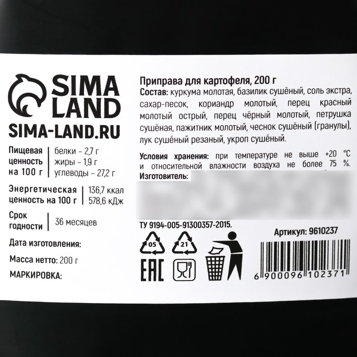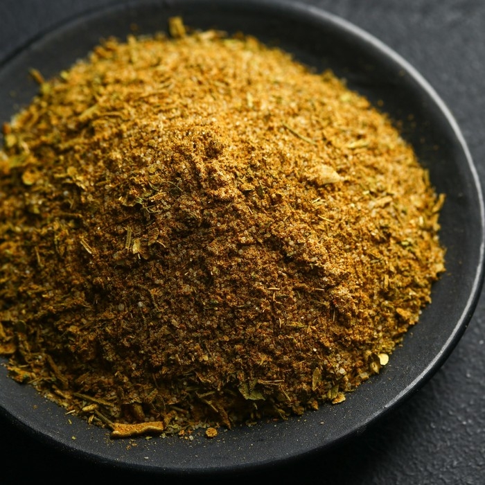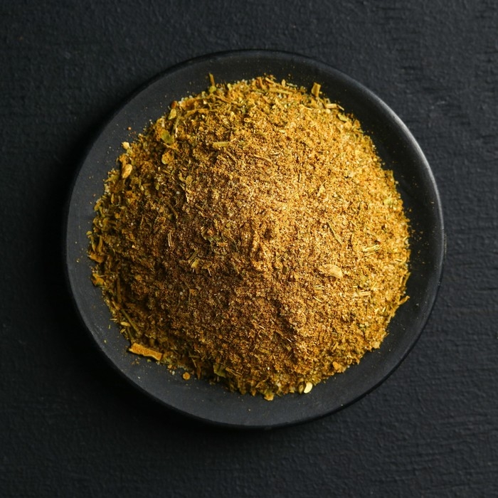 Состав: куркума молотая, базилик сушёный, соль экстра, сахар-песок, кориандр молотый, перец красный молотый острый, перец чёрный молотый, петрушка сушёная, пажитник молотый, чеснок сушёный (гранулы), лук сушёный резаный, укроп сушёный.