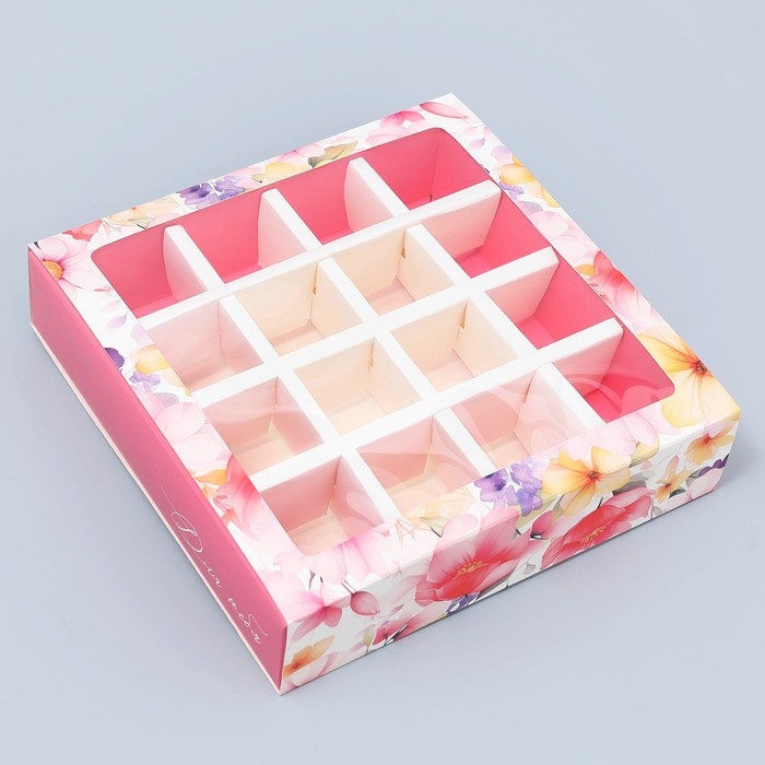 Коробка для конфет, кондитерская упаковка, 16 ячеек, «Цветы» 17.7 х 17.7 х 3.8 см