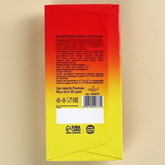 Состав: сахар, какао-масло, какао тёртое натуральное, сухое обезжиренное молоко, молочный жир, эмульгатор Е322 (соевый лецитин 0,4 %), ароматизатор "Ваниль".