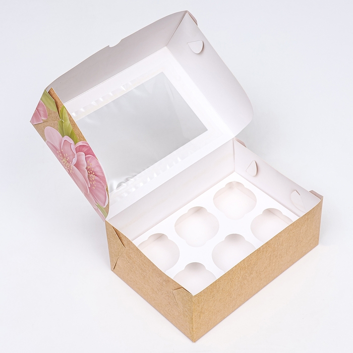 Коробка на 6 капкейков с окном, крафт, 25 х 17 х 10 см