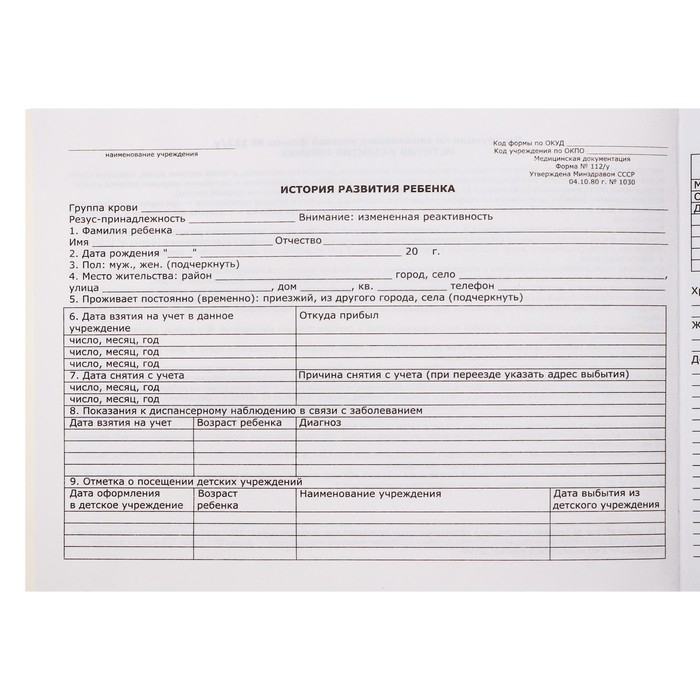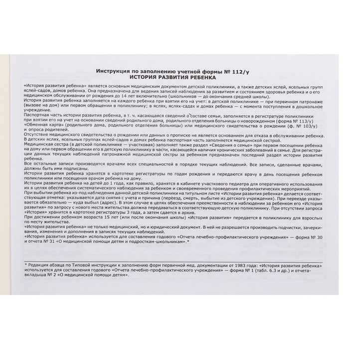 История развития ребенка по форме 112/у является основным медицинским документом детской поликлиники, а также детских яслей, ясельных групп яслей-садов, домов ребенка. Она предназначена для ведения записей наблюдения за развитием и состоянием здоровья ребенка и о его медицинском обслуживании от рождения до 14 лет включительно (школьников - до окончания средней школы)